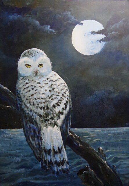 Een groot schilderij met een mysterieus nacht tafereel. De uil heeft een doordringende blik gekregen.